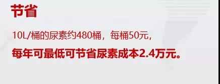 B10寿命150万公里;百公里气耗约30公斤;不需要加尿素,相对柴油车TCO成本降低30%以上;5万公里超长换油里程,故障率更低。