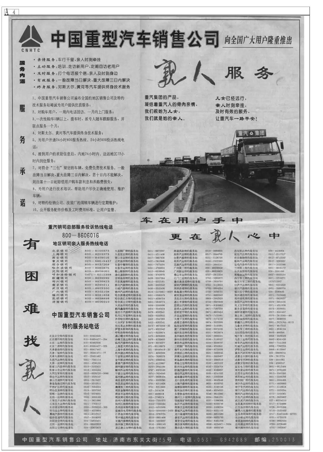 “车在用户手中,更在’亲人’心中”!20年前,《经济日报》整版刊登中国重汽向广大用户推出的“亲人”服务。