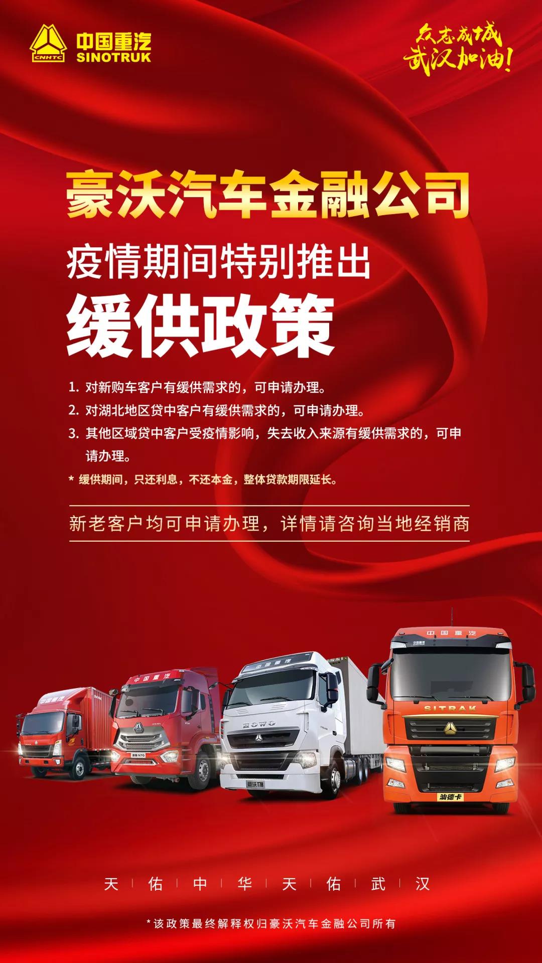 为共同抵抗疫情,更好践行“客户满意是我们的宗旨”的企业核心价值观,中国重汽集团豪沃汽车金融公司特别推出缓供政策:
